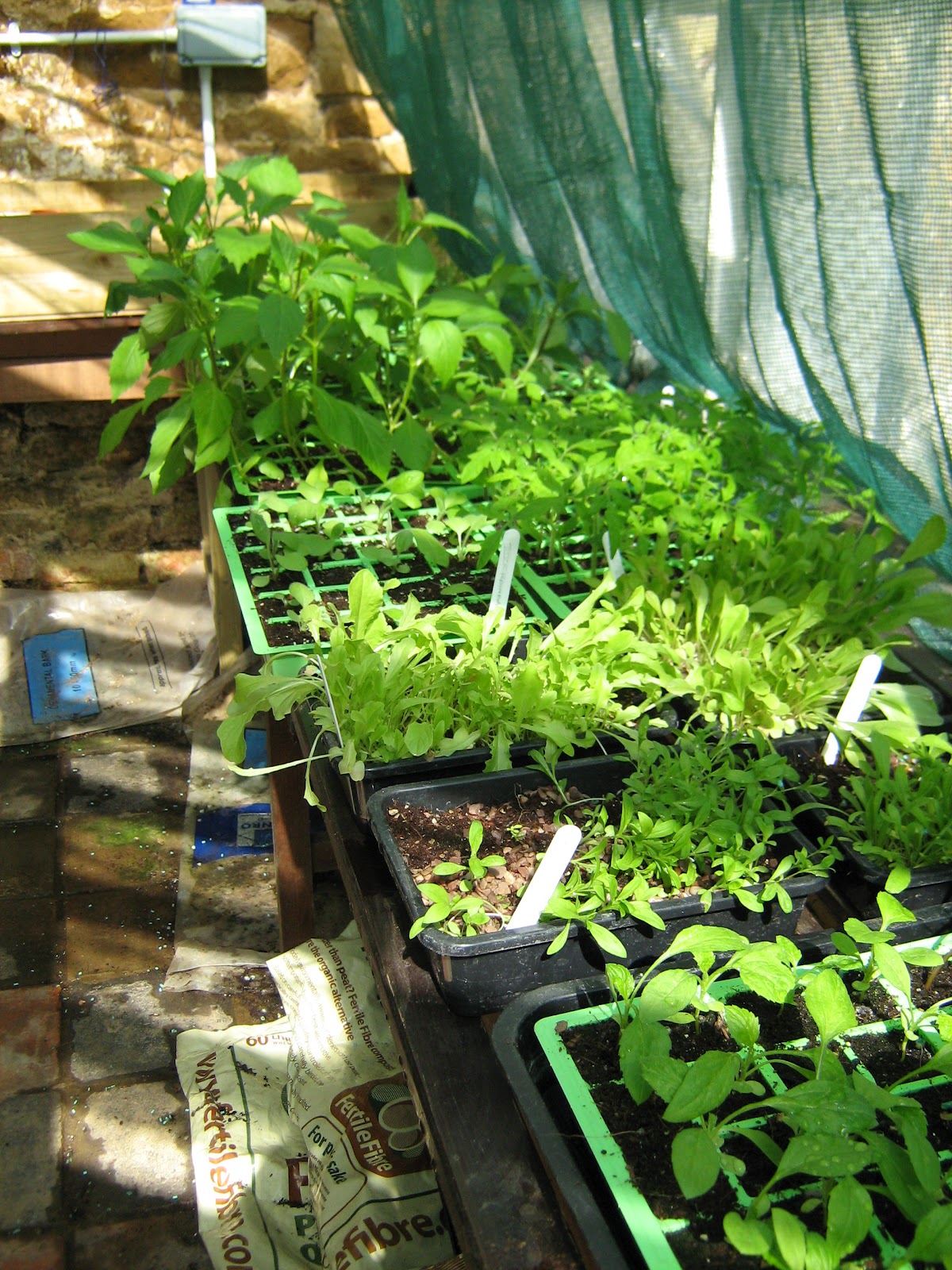 Brassicas - red and green cabbage and calabrese are in place and netted against pigeons and butterflies.